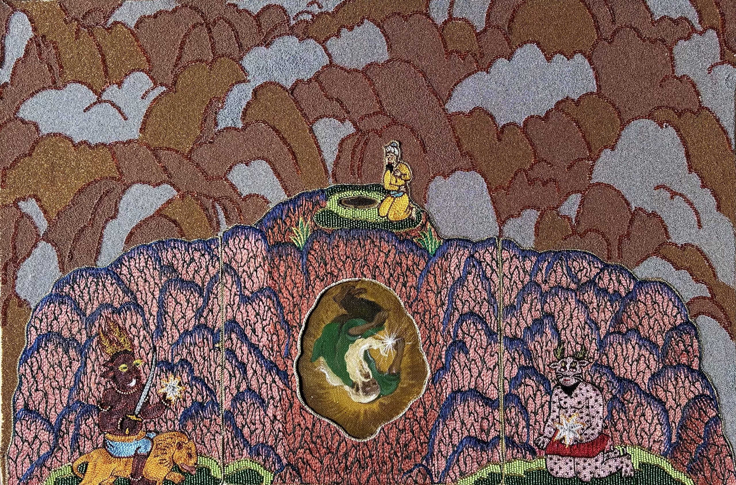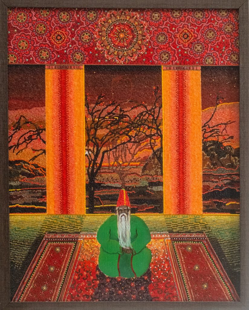 Rizve stages a sensuous archive of presence through heterogeneous links with the past. Rather than a decorative exercise, the repeated patterns and beaded textures become a meditative process just as ritual, dhikr, and breathwork. Seeker and His Land, Storyteller and Symbiotic Kiss are works on a sensate terrain that carries not only pigment but touch. The gesture of carefully stitched and sequenced embellishment reflects the meditative quality of repetitive incantations. These tactile compositions perform memory as an affective encounter. These works are not about memory as content, but as sensations that are embedded and performed through surface and material.